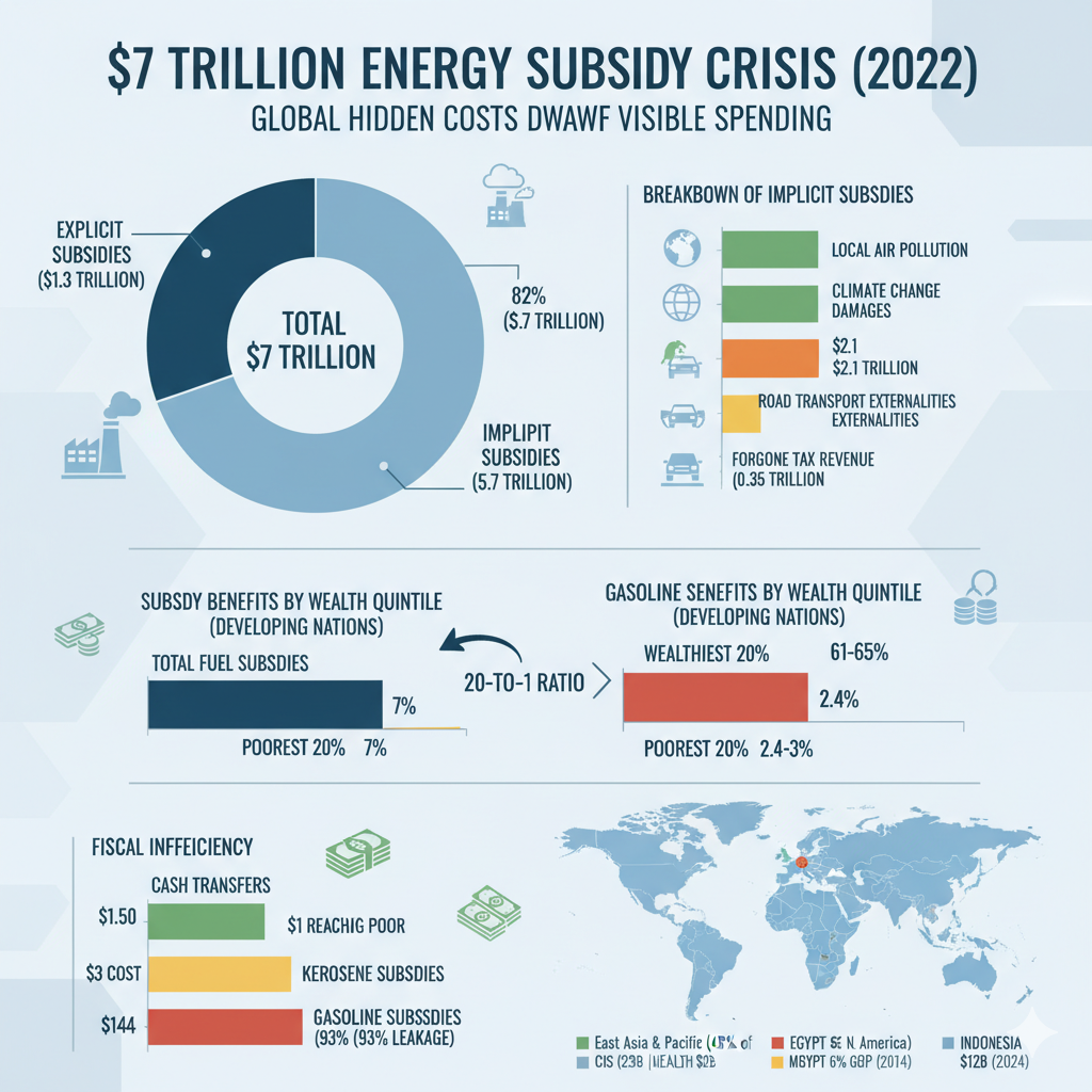 Global fossil fuel subsidies reached a staggering $7 trillion in 2022—7.1% of global GDP— International Monetary FundIMFwith explicit subsidies alone exceeding $1.3 trillion. IMF +5 This represents more than governments spend on education worldwide and rivals healthcare expenditures. IMF Yet attempts to reform these fiscally ruinous subsidies continue to fail spectacularly, triggering deadly protests, government collapses, and policy reversals across developing nations. OpenEdition The latest wave of reform attempts in 2024-2025 reveals why: subsidies function as social contracts between citizens and states, and breaking that contract—even when subsidies overwhelmingly benefit the wealthy—carries political costs few governments can survive.